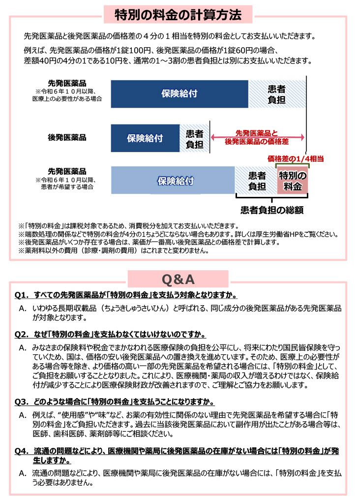 令和6年10月より「患者さんの希望」で先発医薬品を処方した場合は、後発医薬品(ジェネリック医薬品)との差額の一部を選定医療費として自己負担が発生します。